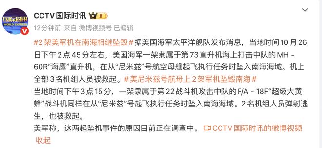 地时间10月26日下午2点45分左右,美国海军一架隶属于第73直升机海上打击中队的MH - 60R“海鹰”直升机,在从“尼米兹”号航空母舰起飞执行任务时坠入南海海域。